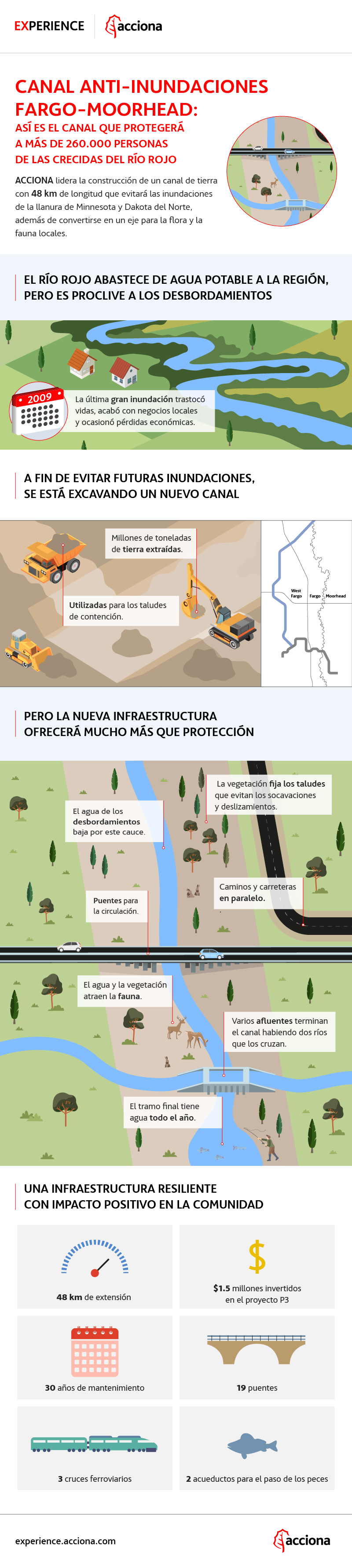 Essa seria a rota pela qual a água correria em caso de cheias do rio Vermelho e de seus afluentes, sem riscos para as residências e as infraestruturas. As dimensões do projeto eram tão grandes e a mobilização de recursos humanos e técnicos tão elevada que foi necessário formar um consórcio de três empresas, do qual a ACCIONA faz parte, com o nome de Red River Valley Alliance (RRVA), para canalizar os 3,2 bilhões de dólares de investimento, dos quais 1,5 bilhão foi destinado à construção do canal. As obras começaram em 2022 e a conclusão está prevista para 2026.
