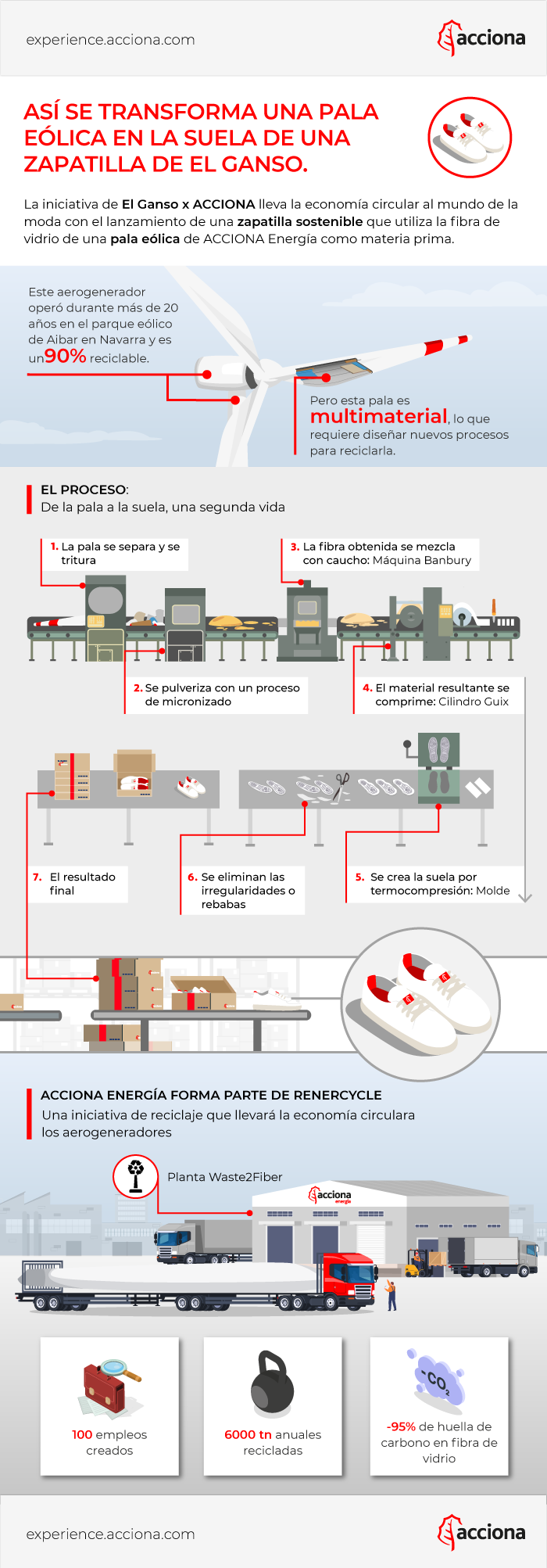 Pero volvamos a la pala con que comenzó este artículo. ¿Qué sucedió con la materia prima que obtuvimos en nuestra planta de reciclaje? Como ya adelantamos, aunque el resto de las palas se han destinado al reciclaje y la valorización, esta en concreto se ha reencarnado en las suelas de una zapatilla diseñada por El Ganso en colaboración con ACCIONA. Es la segunda vez que trabajamos codo con codo y hemos conseguido aumentar la proporción de fibra de vidrio presente en el caucho de la zapatilla hasta el 20 %.