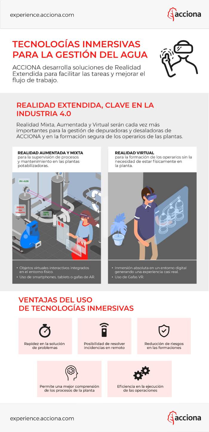 ACCIONA lleva años explorando el potencial de la Realidad Extendida, (término que se utiliza para englobar la Realidad Aumentada, la Realidad Virtual y la Realidad Mixta) en entornos profesionales: paseos virtuales, reuniones con telepresencia, visualización de objetos referenciados para proyectos de construcción…