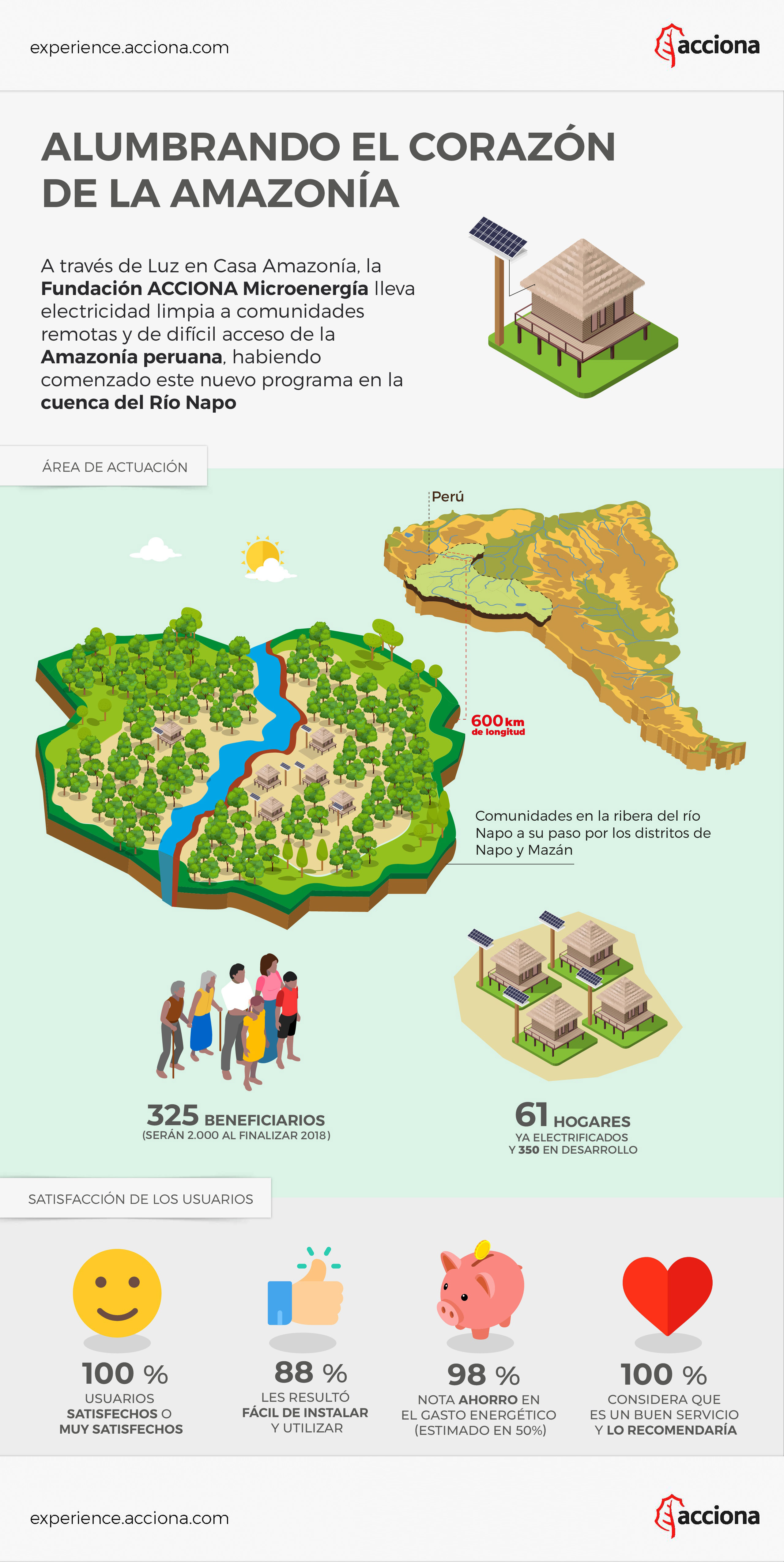 ACCIONA trabaja para facilitar a las comunidades amazónicas acceso a un servicio de electricidad eficiente, barato y sostenible, que ha tenido una gran acogida desde el primer momento: el 100 % de los usuarios están satisfechos o muy satisfechos, al 88 % les resultó fácil de instalar, el 98 % nota el ahorro en el gasto energético (estimado en 50 %) y el 100 % considera que es un buen servicio y lo recomendaría.