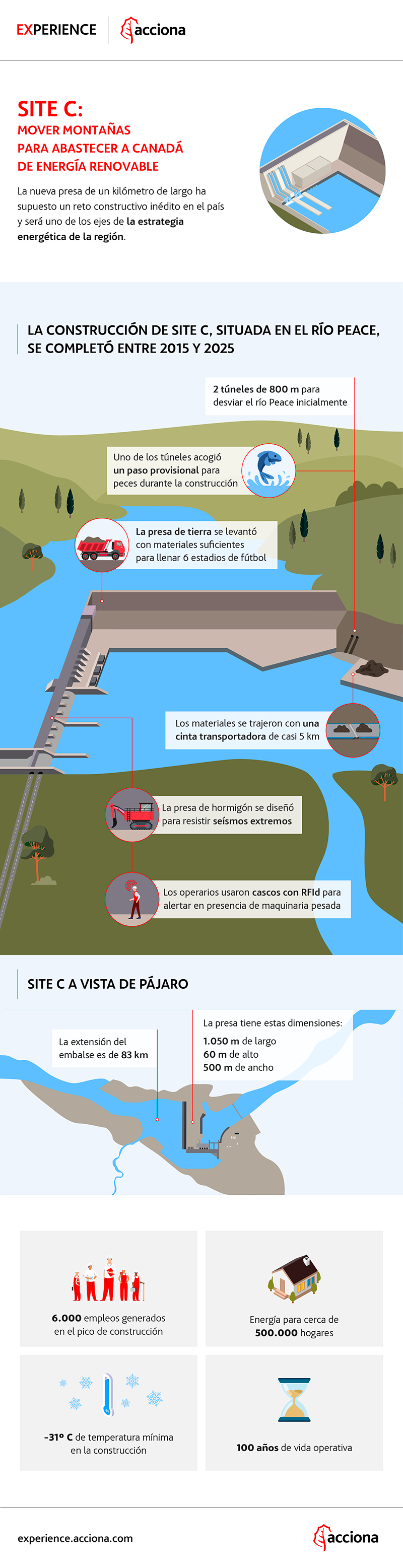 ¿Cuántas infraestructuras energéticas pueden suministrar energía renovable durante un siglo y, a la vez, ofrecer una resistencia a prueba de un terremoto que sucede cada diez mil años? Esa es la misión que el gobierno canadiense encomendó a Site C y lo que exigió un diseño revolucionario por parte de Peace River Hydro Partners (PRHP), la joint venture entre ACCIONA Infrastructure Canada y Samsung Renewable Energy Inc., que se encargó de la ejecución de la mayor parte del proyecto constructivo.