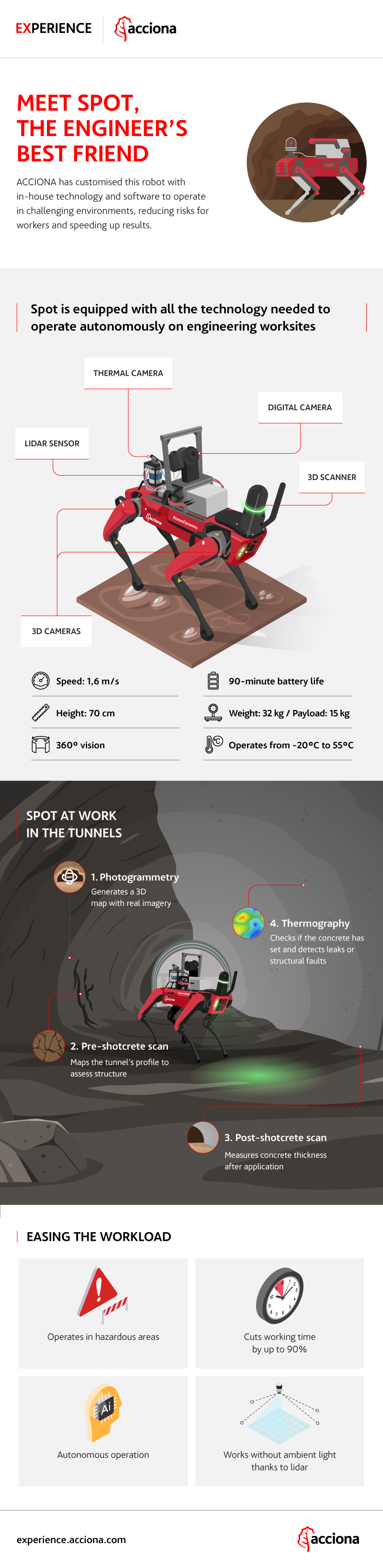At ACCIONA, we view technology and innovation as tools that serve people. Spot is just one example of how we put them into practice to safeguard human lives and boost the sustainability of our projects. Another demonstration of this approach, also focused on the underground world, is our use of immersive reality for monitoring and operating tunnel-boring machines, which you can explore in this story.