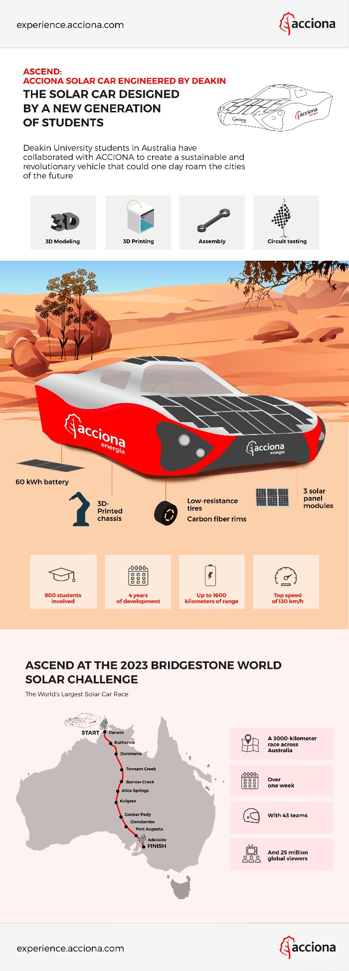 At ACCIONA Energía, we know all about dedication to the development of great renewable energy infrastructure contributing to decarbonizing the world. Our work extends far beyond wind farms or photovoltaic plants. We also support projects that prove you can do many things with a sustainable mindset. The company invests in projects with immense transformative potential on a technological and, above all, human level. We are talking about ASCEND, an acronym for the Acciona Solar Car ENgineered by Deakin, the fruit of our alliance with Australia‘s Deakin University, who is in the top 1 per cent of universities worldwide.