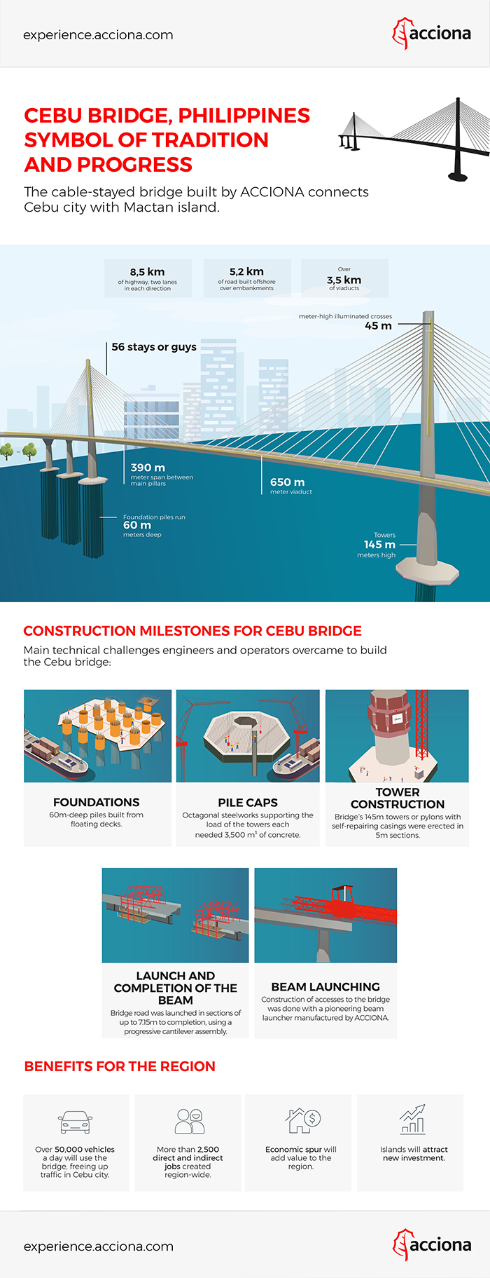 Today, five centuries later, this ancestral sea and its “bustling, coconut-smelling port” – as Gil de Biedma called it – is home to an incredible engineering work which is once more putting the Philippines on the map, and the route to progress and improved communications. That is, the Cebu bridge built by ACCIONA.
