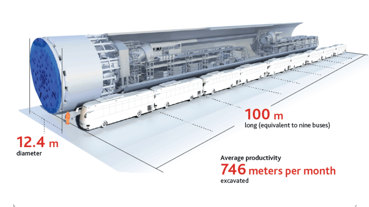 Two giants were meanwhile hard at work below the surface. With diameters of 12.4 meters – the height of a four-story building – and lengths of 100 meters – equivalent to nine buses lined up one after the other – and each weighing 2,800 metric tons – 23 blue whales – the tunnel boring machines, Joyce and Annabell, drilled through the earth in both directions at an average rate of 746 meters per month, setting a one-day record in the process of 49.7 meters.