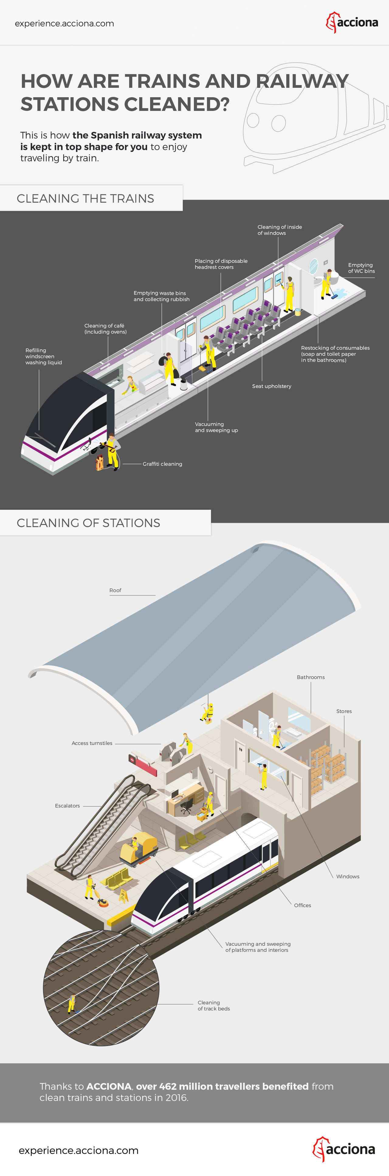 Keeping these “sets” in shape, so that travellers can get on undistracted with living out their own real-life stories, is the mission of ACCIONA. Over 2,000 workers offer an end-to-end service 24 hours a day seven days a week, including cleaning and maintenance of trains, stations, offices and logistic warehouses throughout the railway network Renfe manages in Spain. In 2016 alone, a total of 462 million passengers made use of long and mid distance, high-speed and local trains and stations in Spain. Yet this fast-paced, continuous throng of passengers through the stations can scarcely be aware of the professional work that goes around them: the care that goes into cleaning platforms, escalators, turnstiles, toilets, windows, domes, tracks, and so on.