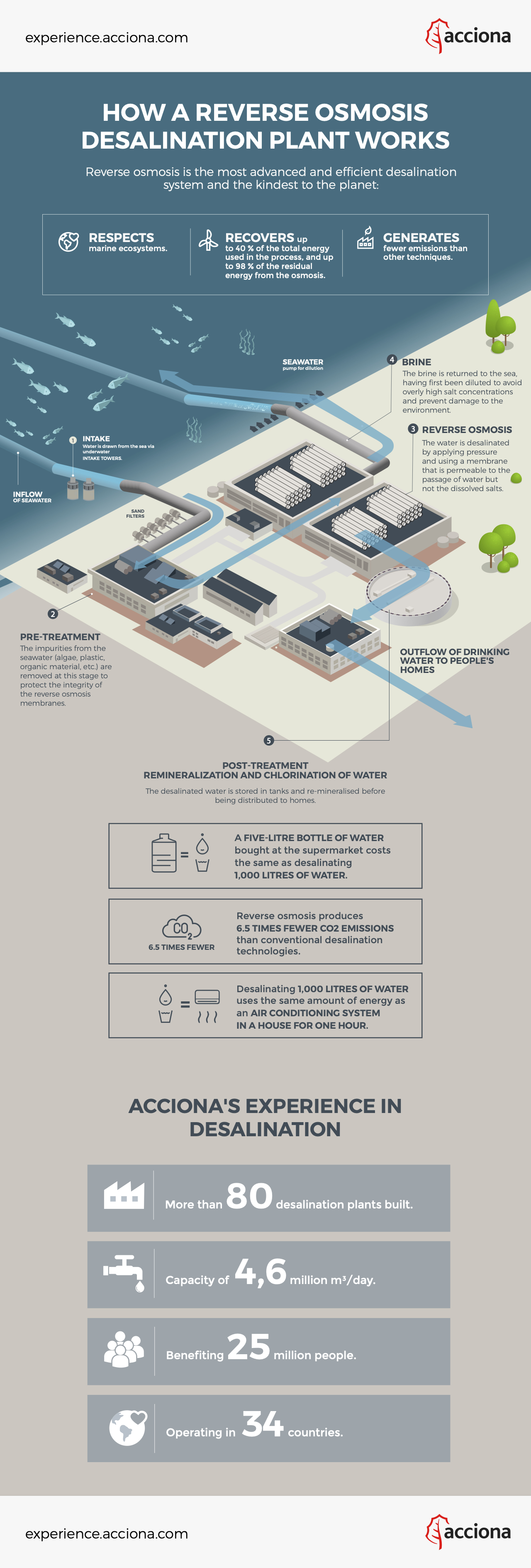 Converting seawater into drinking water is technologically possible. At ACCIONA we have been doing this for a long time in our reverse osmosis desalination plants, nowadays using the most advanced, efficient and environmentally friendly technology.